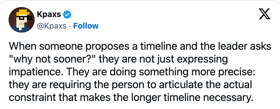 This is a smart point. “Why not sooner” feels annoying, and impatient. But not if you take it literally. “Why not sooner” as in… what is limiting us from making this happen sooner (find the bottleneck) and perhaps you can eliminate it 20% of the time.